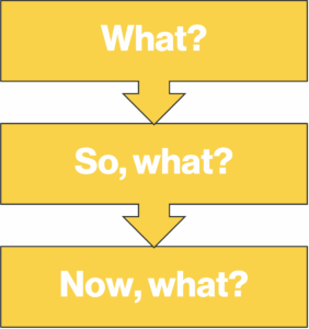 So What? — What’s the meaning? What patterns are emerging? What insights, interpretations can we draw? What might this mean for us?